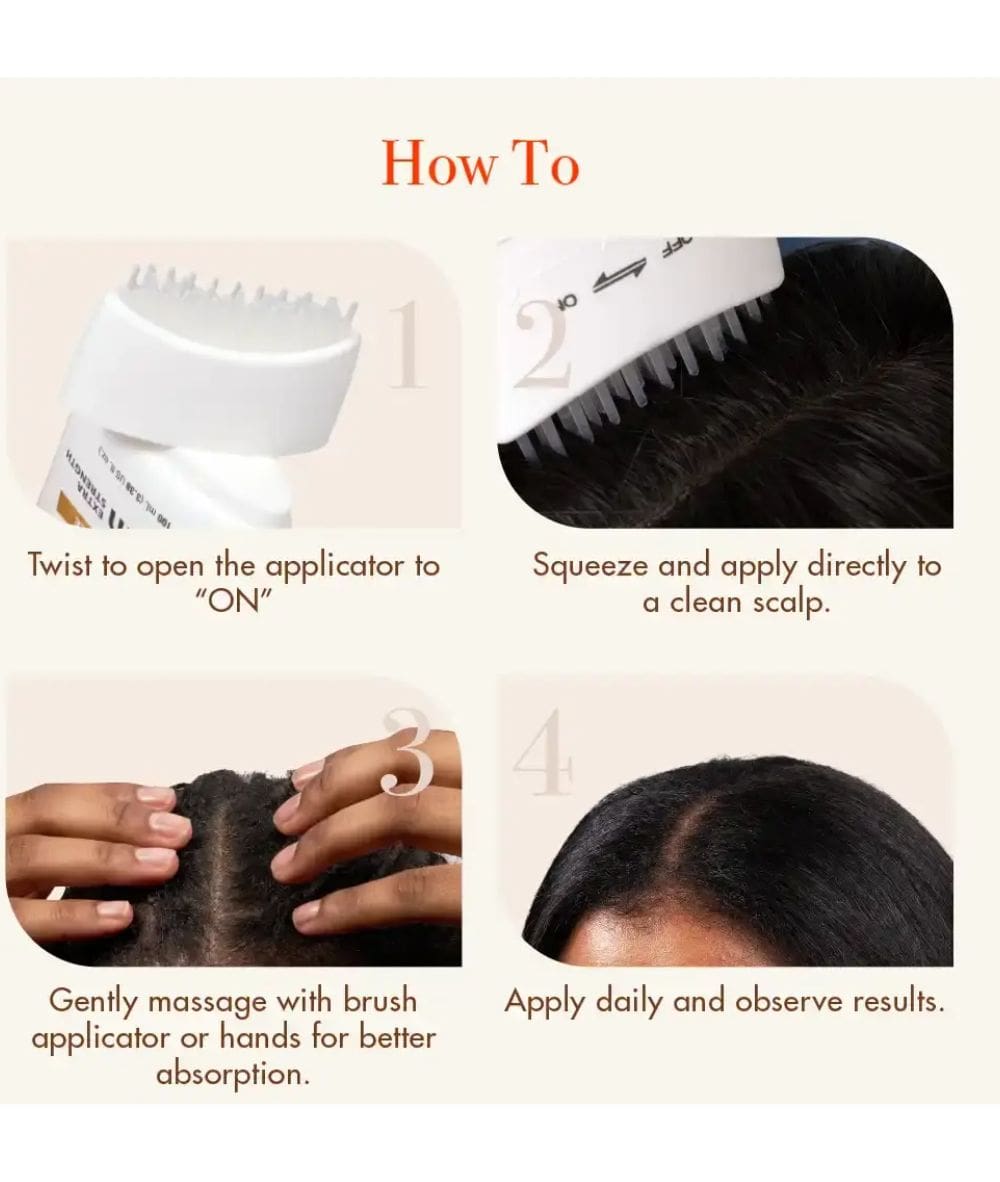 Use the included brush applicator to apply 1–2 drops directly onto thinning or problem areas such as the hairline, crown, or temples