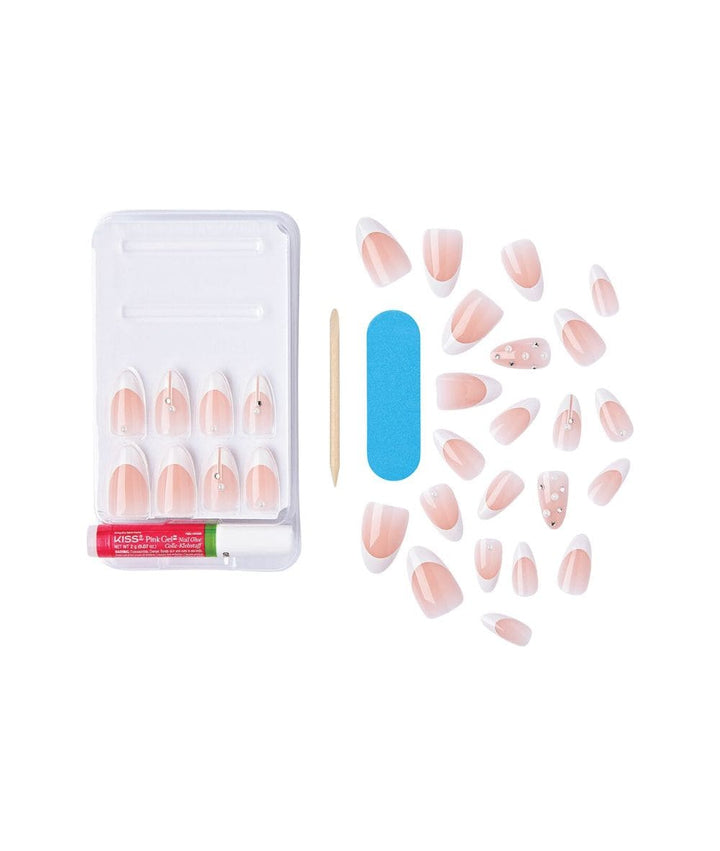 Achieve a salon-quality French manicure in minutes with KISS Classy Nails Premium Highlights #CSP09. These medium-length, almond-shaped press-on nails feature a timeless white tip design enhanced with subtle jewel accents, offering a sophisticated and polished look suitable for any occasion.